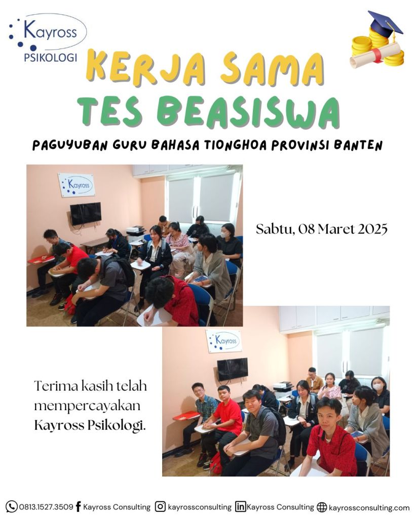Pada tanggal 8 Maret 2025 Kayross Psikologi telah mengadakan kerja sama dalam pelaksanaan psikotes seleksi beasiswa dengan Paguyuban Guru Bahasa Tionghoa Provinsi Banten. Psikotes beasiswa merupakan salah satu tahapan penting dalam proses seleksi penerimaan beasiswa yang dilakukan oleh berbagai institusi pendidikan. Tes ini bertujuan untuk menilai kemampuan kognitif, kepribadian, sikap belajar/kerja, kondisi emosi serta kesiapan calon penerima beasiswa. Dengan persiapan yang matang, peluang untuk mendapatkan beasiswa akan semakin besar. Setiap tes dirancang untuk mengukur aspek-aspek penting yang dibutuhkan dalam dunia akademik. Oleh karena itu, mengikuti tes dengan pendekatan yang tepat dapat membantu peserta dalam meraih hasil maksimal.