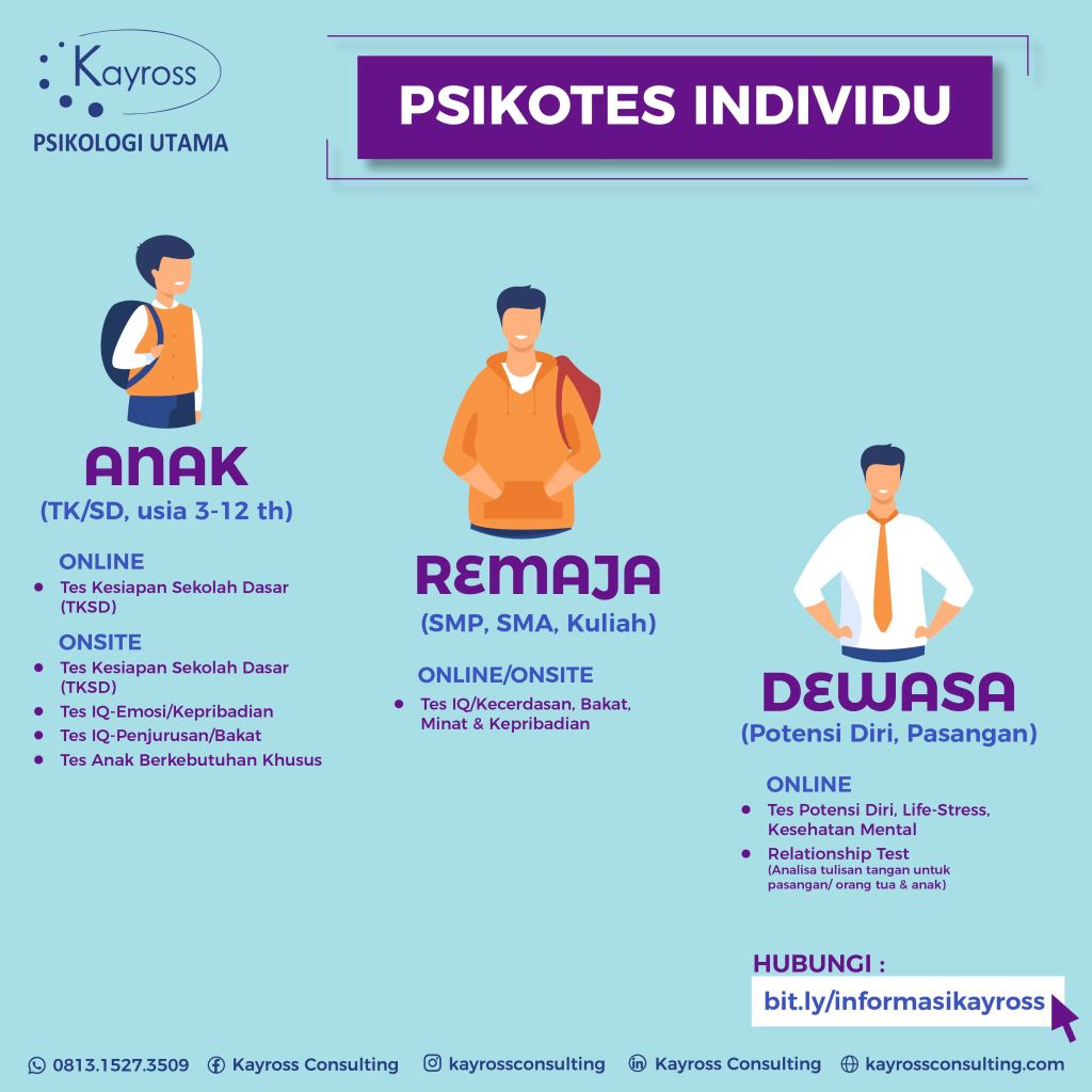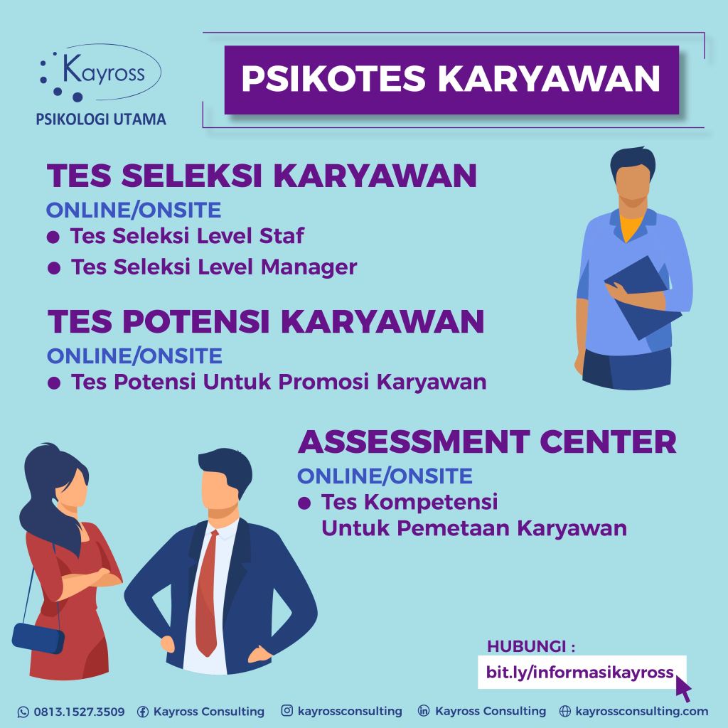 Kayross Consulting hadir untuk memberikan layanan psikologi, khususnya dalam bidang assessment atau tes psikologi, baik bagi perorangan, sekolah maupun bagi perusahaan atau organisasi. Tujuan dari penyelenggaraan suatu assessment psikologi adalah untuk memberikan gambaran mengenai aspek kognitif, sikap kerja dan kepribadian individu.